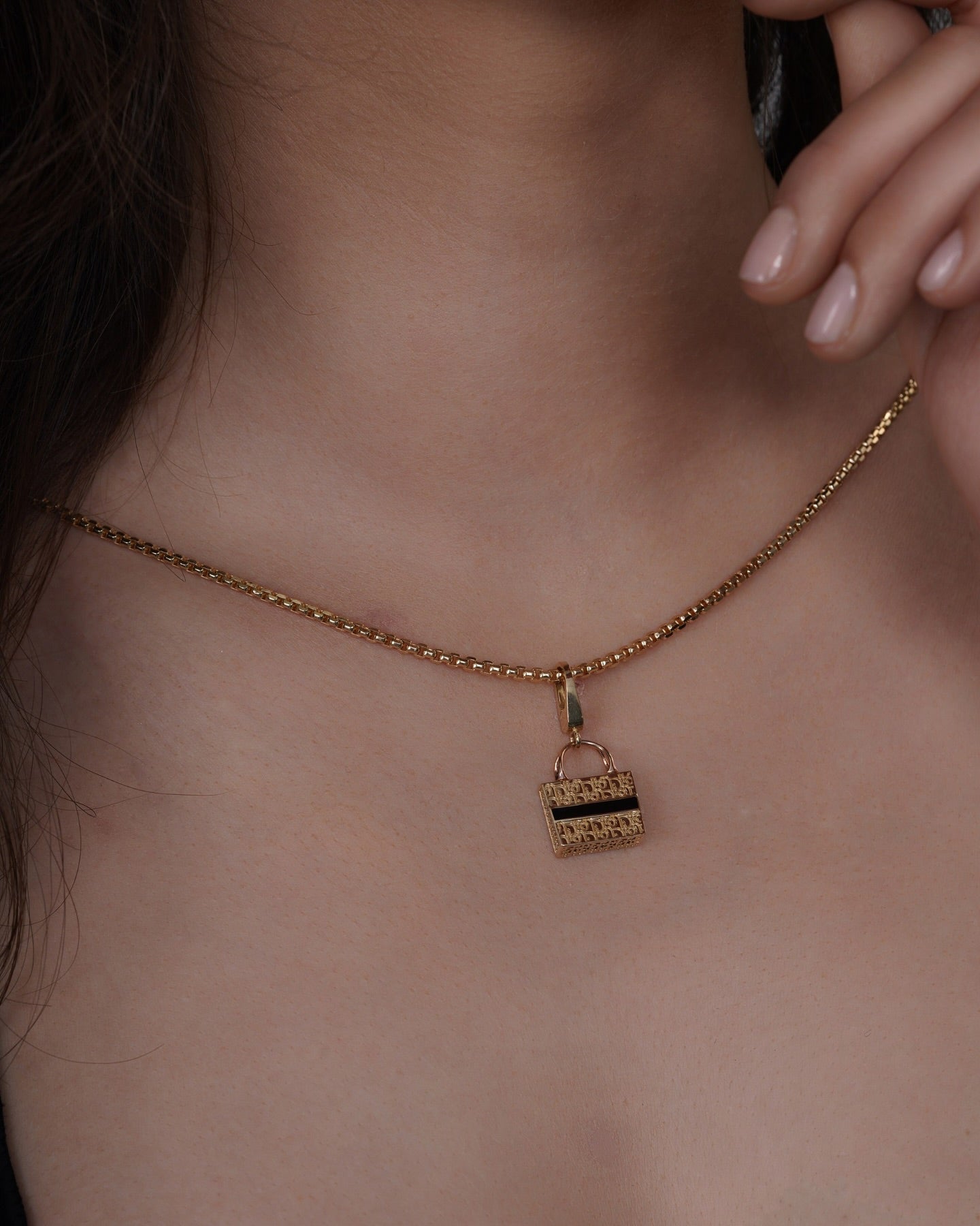 This yellow gold charm has a black enamel band to contrast with the polished yellow gold.