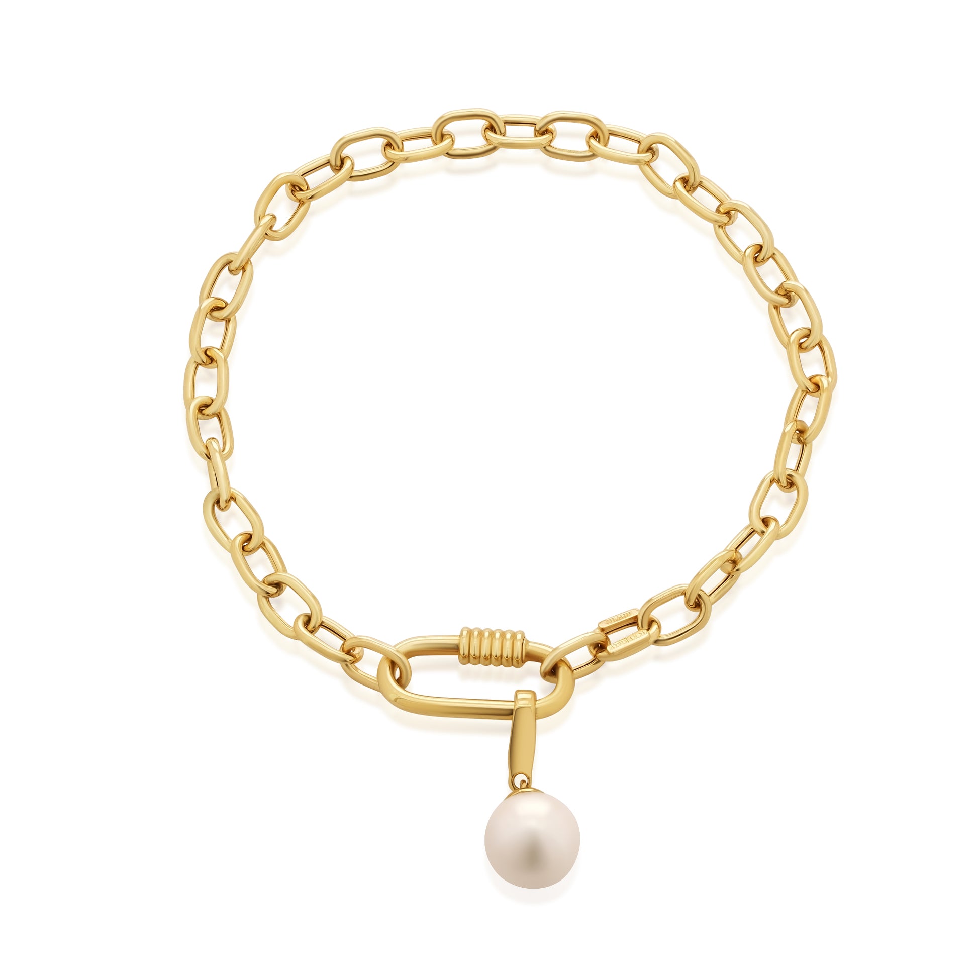 Feel elegant with our iconic pearl charm gold bracelet. The round pearl has a hinged bail which makes it versatile if you'd like to keep it on or remove it.