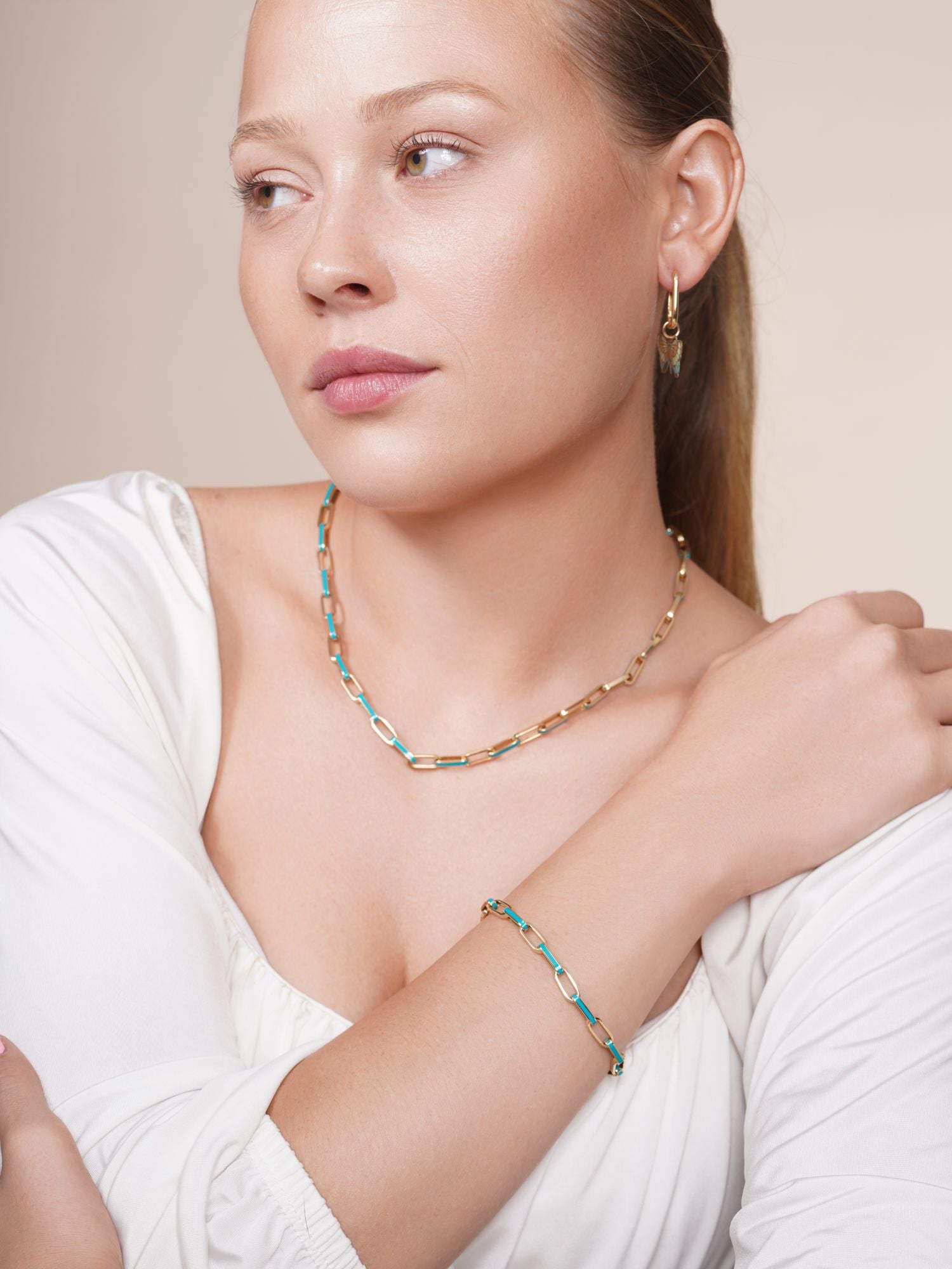 Get ready to feel stylish. This dazzling paperclip necklace will transform any outfit with eye catching turquoise color. The 14k. yellow gold necklace has a bold statement.
